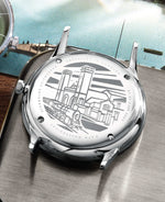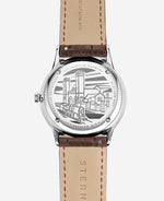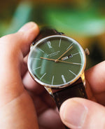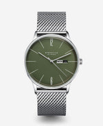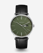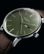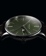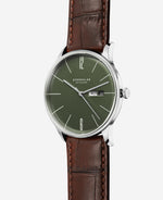 Inspiriert vom Berliner Bahnhof im Hamburg der 1850er Jahre. Das olivgrünfarbene, gewölbte Zifferblatt gemeinsam mit der Wochentagsanzeige und dem kratzfestes Saphirglas machen die Berlin bereit für das 21. Jahrhundert.