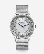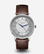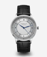 | Zifferblatt | weiß (satiniert), silber (Rundschliff) |